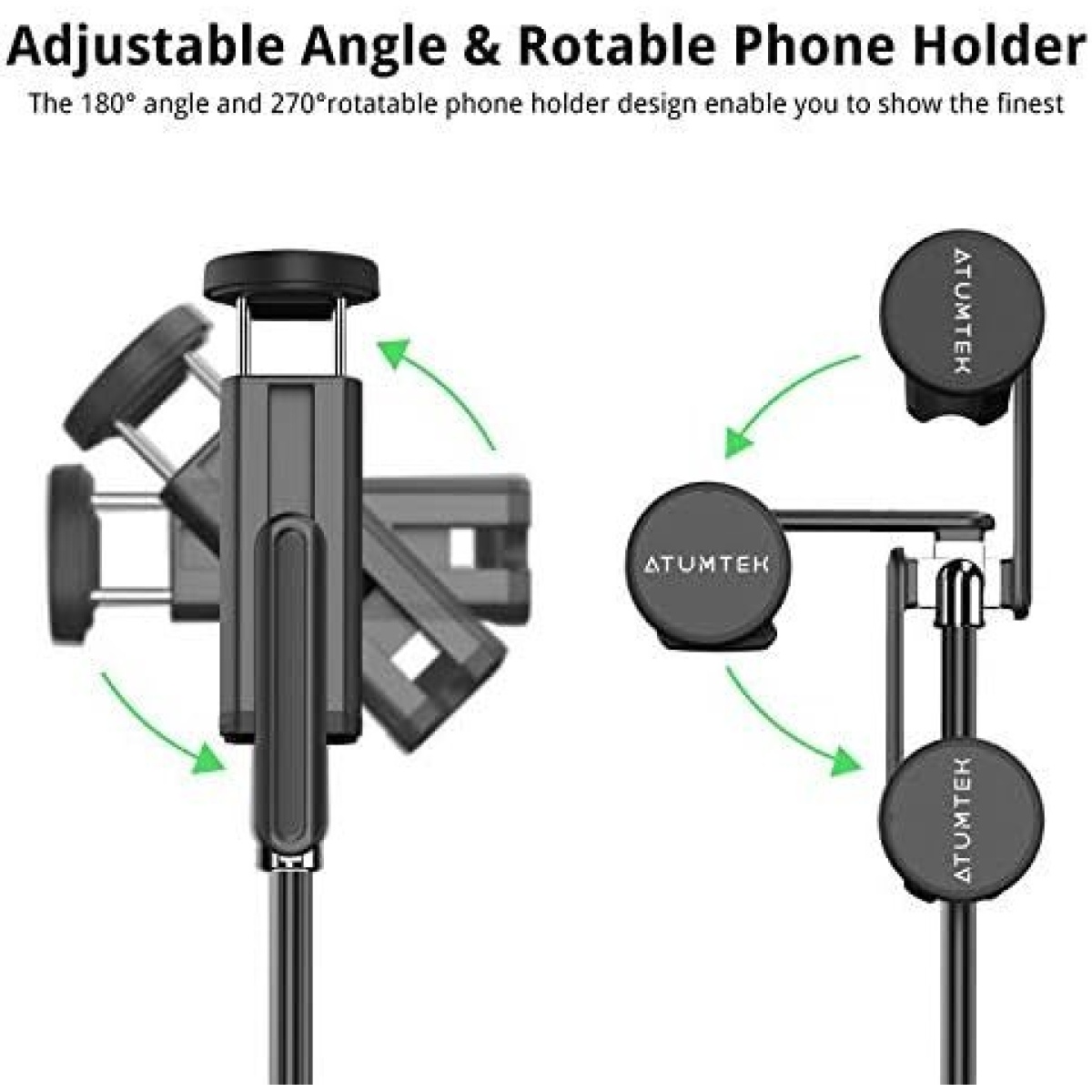 • [Adjustable Angle & Rotatable Phone Holder] – The ATUMTEK Bluetooth Selfie Stick features a 270-degree rotatable phone holder design that supports both horizontal and vertical clamping of mobile phones. The 180-degree rotation allows you to select the perfect angle for your photos. The phone holder accommodates devices with widths up to 3.54 inches.