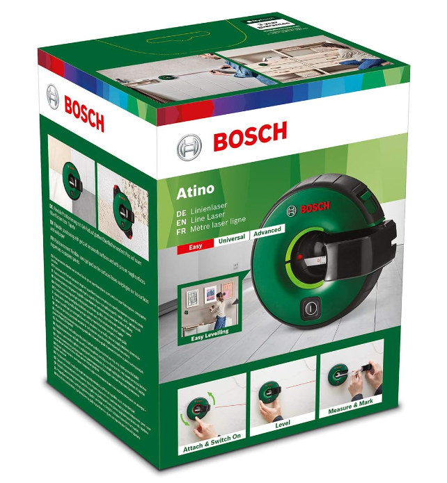 The Bosch Atino line laser makes levelling objects more than easy – without the need for further help. The levelling device features an integrated measuring tape (1.5 m working range) which can be pulled out along the laser line, and thus provides all relevant features for precise aligning and measuring of distances in one tool. Therefore, it enables a fast and flexible positioning of the tool on the wall. The reusable and washable gel pad can be easily attached to smooth surfaces such as tiles, marble, concrete walls, and smooth wooden or painted surfaces. One gel pad can be reused around 60 times. Once the retention force of the gel pad weakens, it can be replaced. Gel pads are available as separate accessories. When it comes to rough surfaces or wallpaper, the pin adaptor with the two small pins is the ideal attachment solution. The Atino provides high levelling flexibility as the laser line (minimum length of 1.7 m) can be levelled horizontally or vertically at 0°, 90°, 180°, and 270° by using the intuitive LED indication. A red LED ring means that the laser line is not levelled, upper yellow LED indicates that the laser line needs to be slightly adjusted upwards while the lower yellow LED requires a small adjustment downwards. If the LED ring lights up green, the laser line is precisely levelled. Bosch´s Atino is suitable for aligning and attaching pictures, shelves, mirrors, and handles on cabinets or a TV in an easy, fast, and flexible way. Scope of supply: