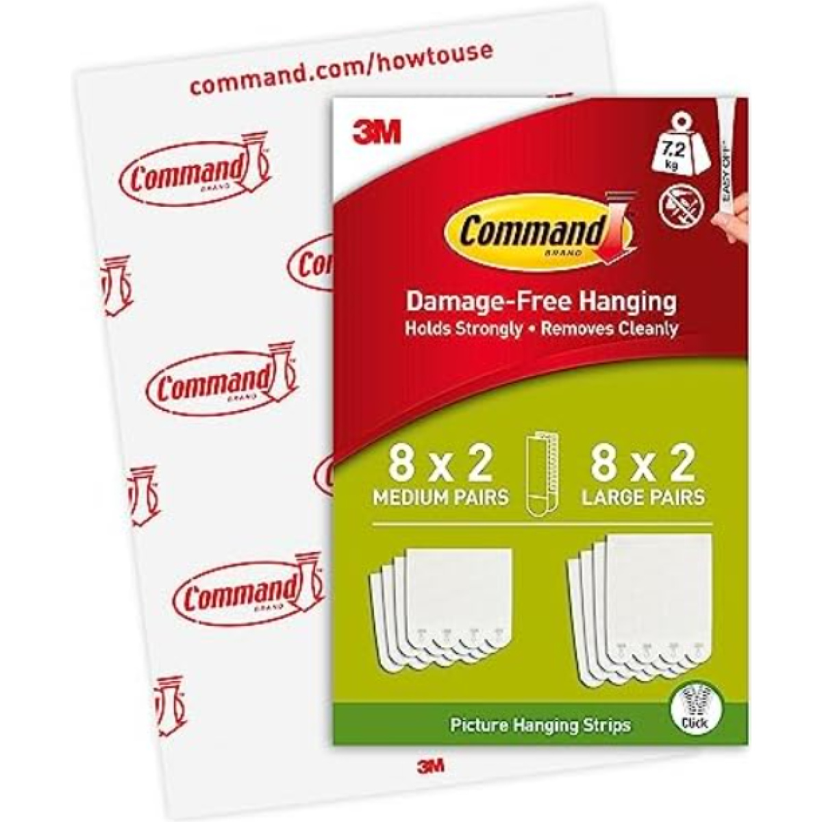 INCLUDES- 8 Pairs of Medium 8 Pairs of Large White Command Picture Hanging Strips (32 Strips total) 4 Medium Pairs hold 5 4kg Maximum frame size of 45cm by 60cm 4 Large Pairs hold 7 2kg Maximum frame size of 60cm by 90cm