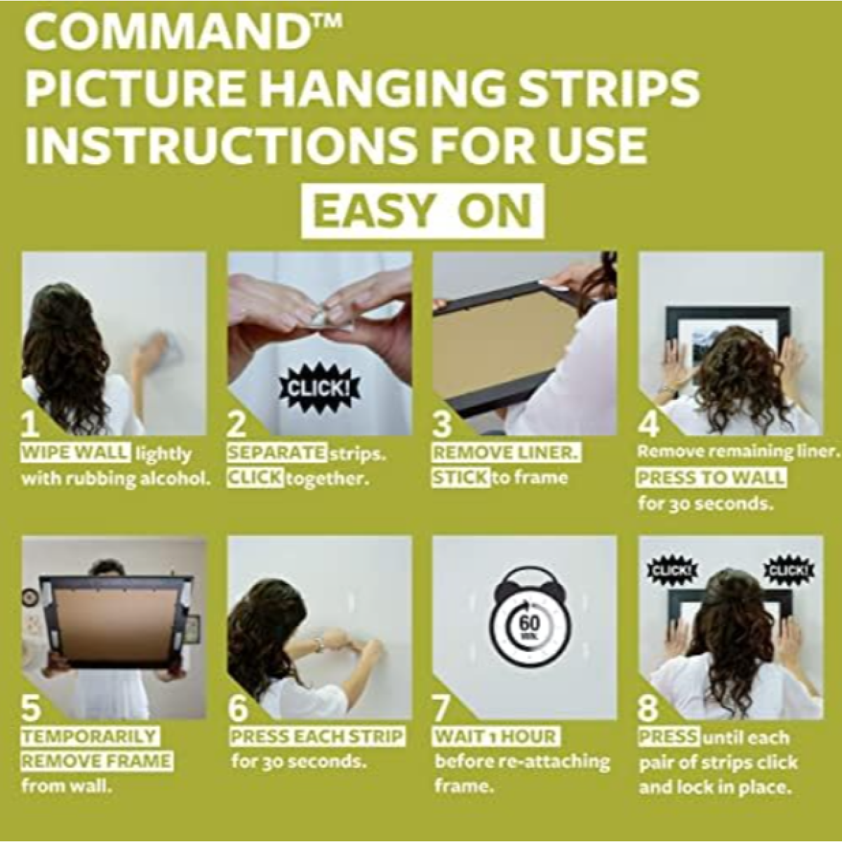 DAMAGE-FREE DECORATING- Say goodbye to holes marks or sticky residue on your walls Command Picture Hanging Strips by 3M are easy to use and help keep your walls looking beautiful