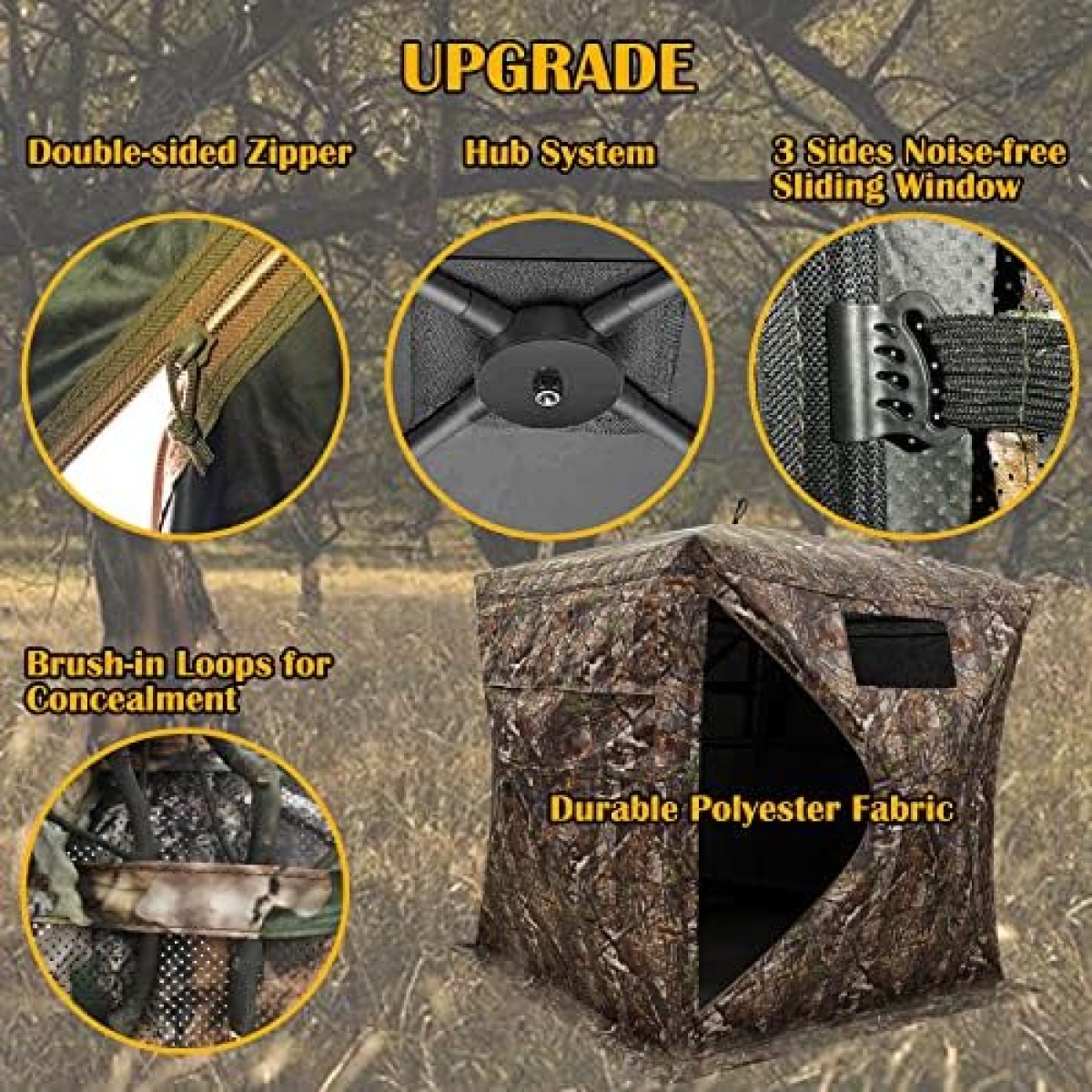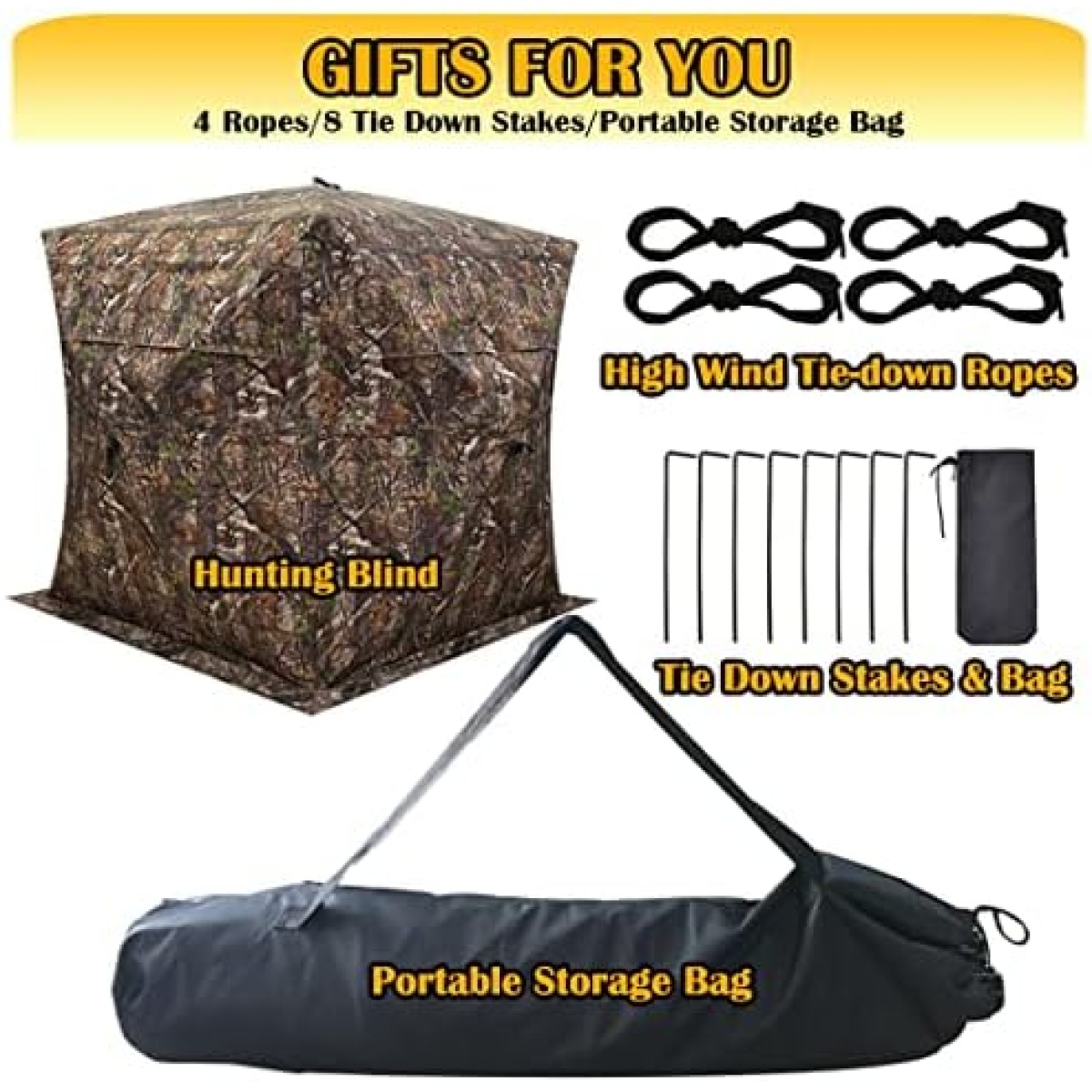 【Portable】Comes with the portable carry bag,you can take it anywhere easily.The tie down stakes (8 pieces) and high wind ropes (4 pieces) are included in the package to help you easily set up and fix the hunting blind.