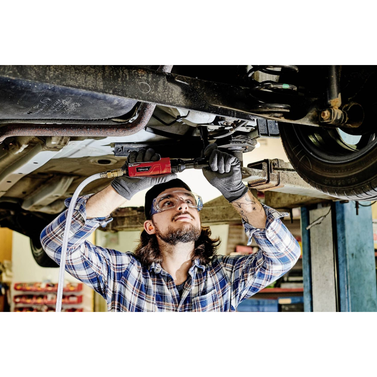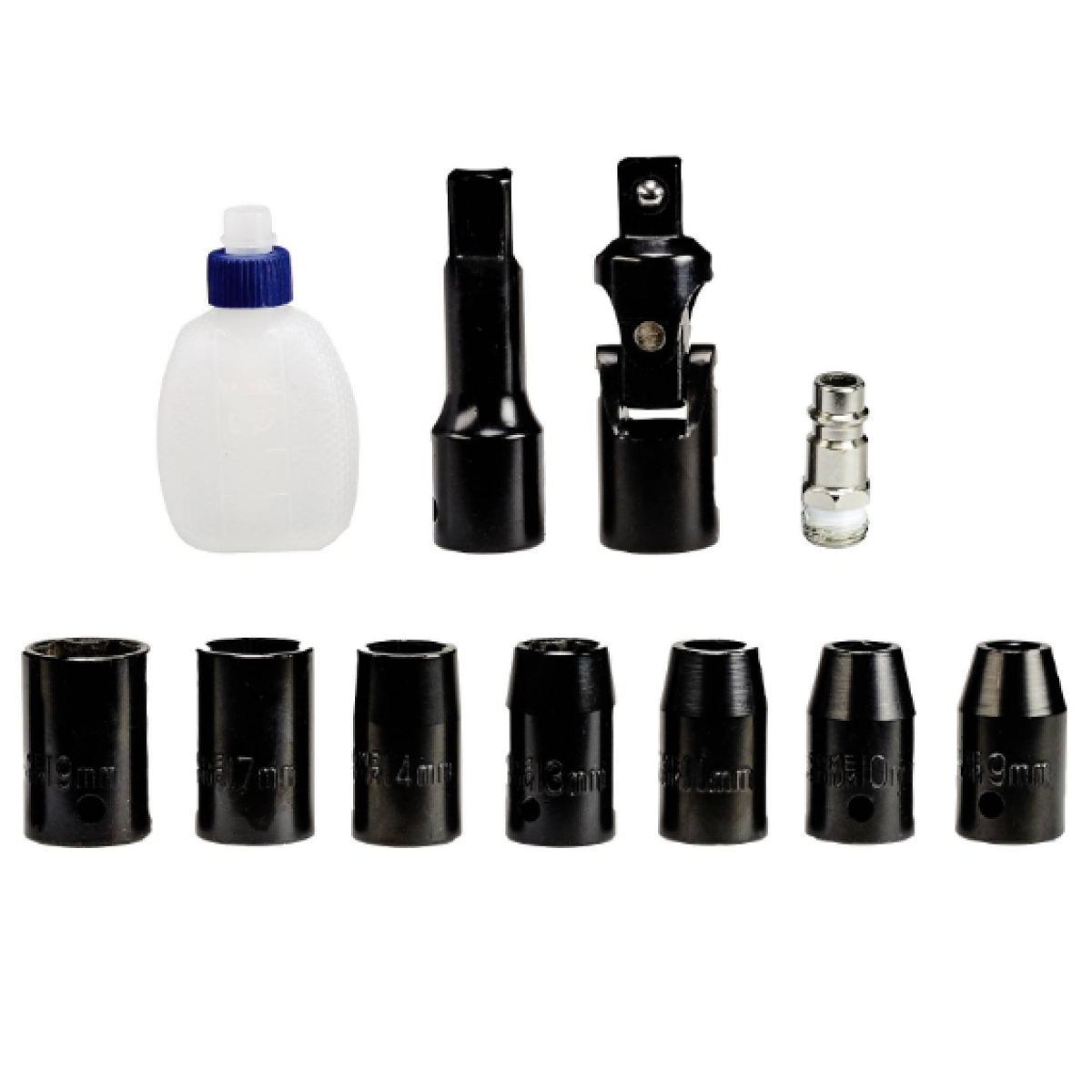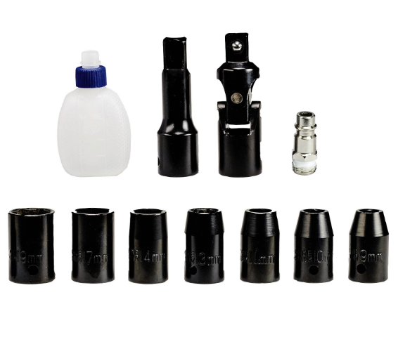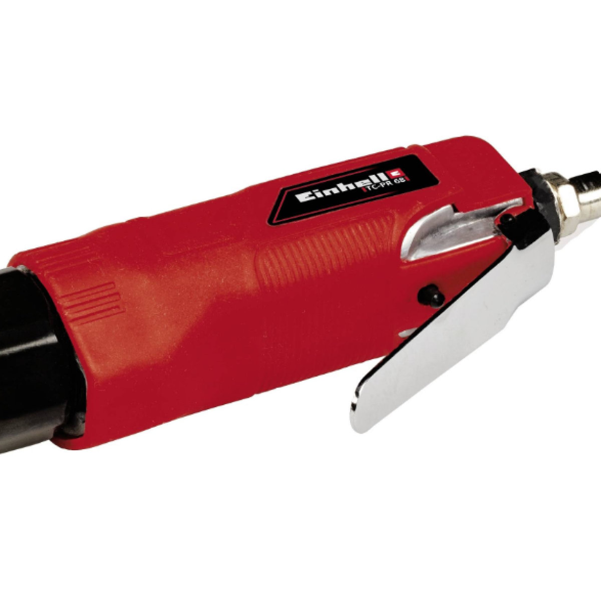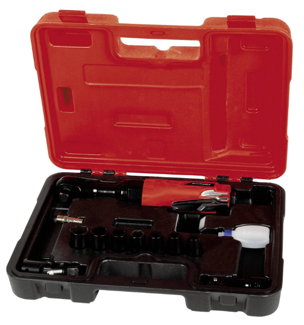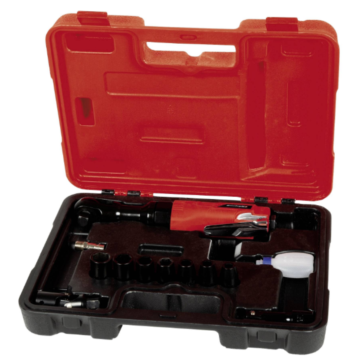 The Einhell compressed air ratchet screwdriver TC-PR 68 is a handy and powerful helper when screw joints are to be fixed or loosened. The ratchet screwdriver has a maximum torque of 68 Nm. The non-slip handle makes working safe and comfortable. The compressed air screwdriver offers best performance from a hose inner diameter of 9 millimeters. The ratchet head can be used to adjust both clockwise and anti-clockwise rotation. In addition to 7 socket wrenches in the sizes 9/10/11/13/14/17/19 millimeters, an extension and a cardan joint, the ratchet screwdriver is equipped with a plug nipple and an oil bottle. Supplied in a practical transport and storage case.