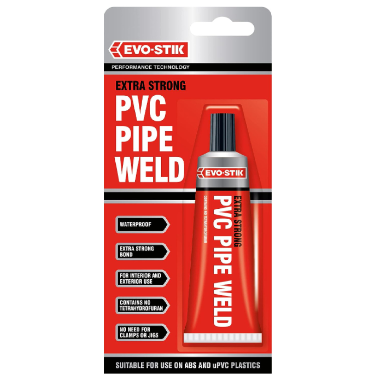 Contents: 1x EVO-STIK PVC Pipe Weld, Extra Strong, For ABS and uPVC Plastics, Waterproof, Interior and Exterior Use, 50ml