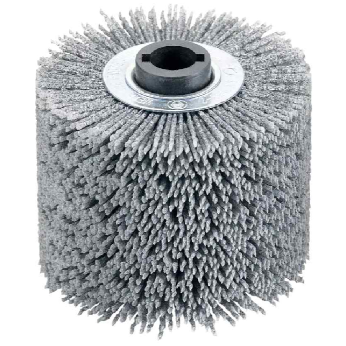 Abrasive grain-enforced plastic brush, thereby no loosening of the abrasive grain from the substrate. For brushing wooden surfaces, removing paint residues and brushing off annual rings in softwoods. With 4-groove roller core, suitable for all devices with 19 mm keyway spindle.