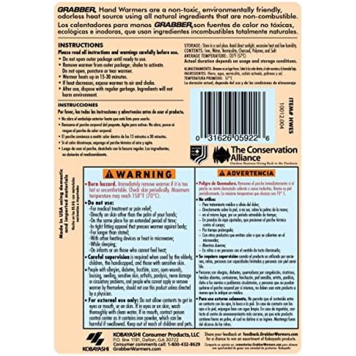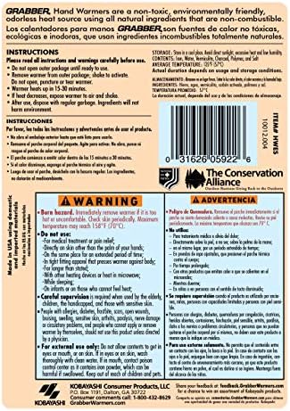 Conquer The Cold! Grabber Warmers are single use air-activated heat packs that provide everyday warmth and are ideal for keeping your body warm when the temperature gets cold. Grabber Hand Warmers are a non-toxic, odorless heat source using all-natural ingredients that are non-combustible. Specs & Details: • Quantity: 20 Hand Warmers (10 Pair). • Duration of Heat: Up to 7 hours of heat. • Activation Time: 15-30 minutes. • Average Temperature: 135 degrees Fahrenheit (57 degrees Celsius). • Max Temperature: 156 degrees Fahrenheit (69 degrees Celsius). • Ingredients: Iron, Water, Cellulose, Vermiculite, Activated Carbon, and Salt. • Storage: Keep in a cool place out of direct sunlight. Directions – Simply open the outer package and expose the packet to air. No shaking is necessary. For best results, use the hand warmers in an enclosed area with air such as a pocket or glove. Buy with Confidence – To ensure you receive genuine Grabber products when shopping online, please only purchase from authorized distributors or retailers or an Amazon listing that clearly states the product is sold and shipped directly by Amazon.com. Unauthorized sellers, such as private sellers (not commercial sellers) may offer outdated products or imitations not meeting Grabber quality standards. We want our customers to purchase our products with the confidence that they are getting genuine, quality Grabber products.