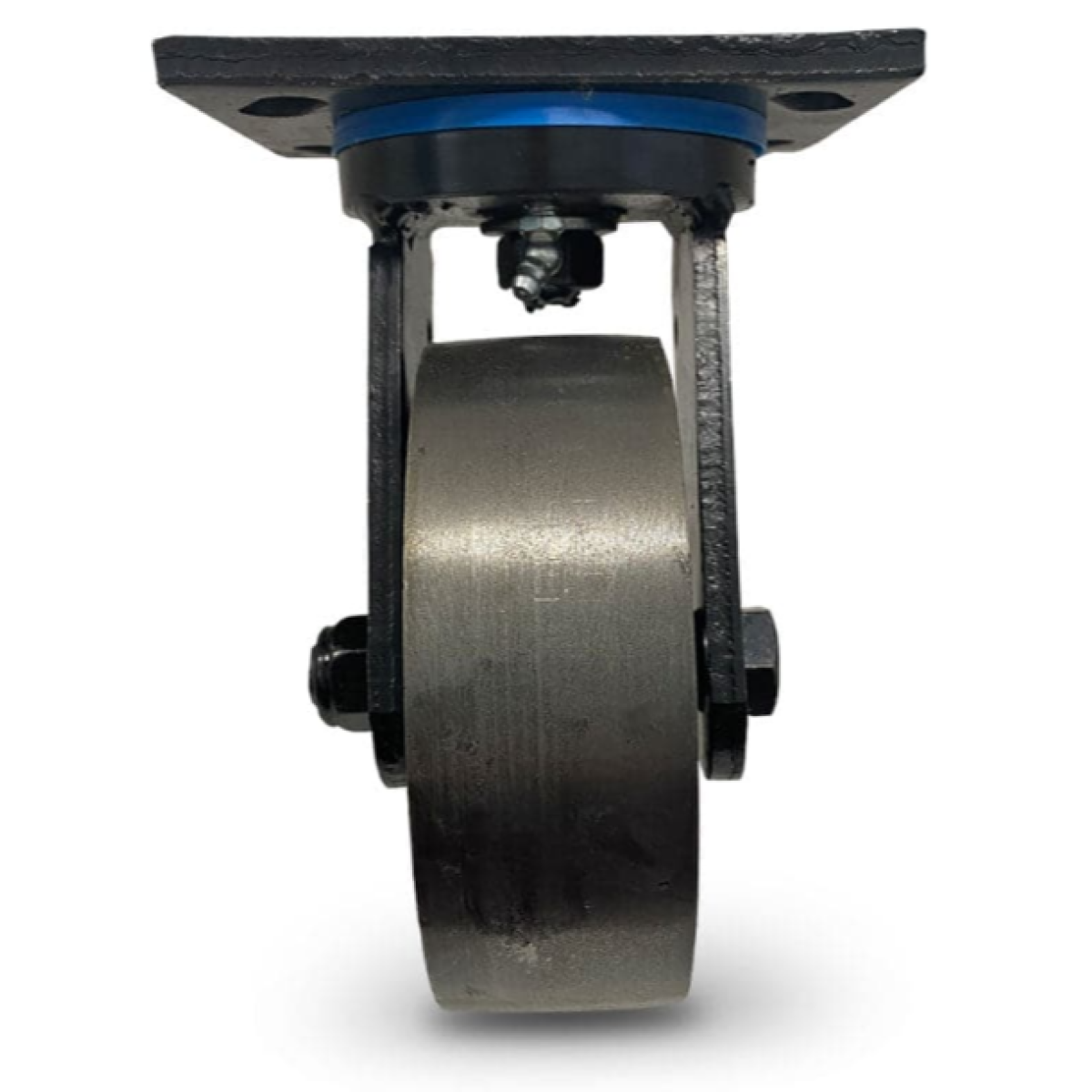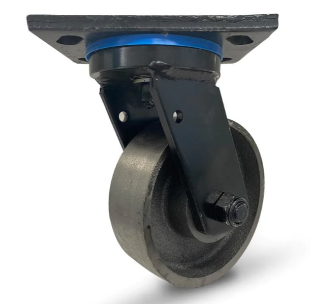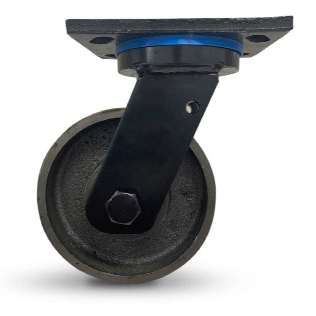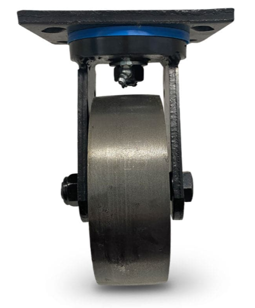 EXTREME HEAVY DUTY fabricated steel componentry with black zinc finish for corrosion resistance. Full cast iron, double ball bearing core centered wheel. Suitable for use on automotive assembly lines, aviation trolleys and in production manufacturing plants.