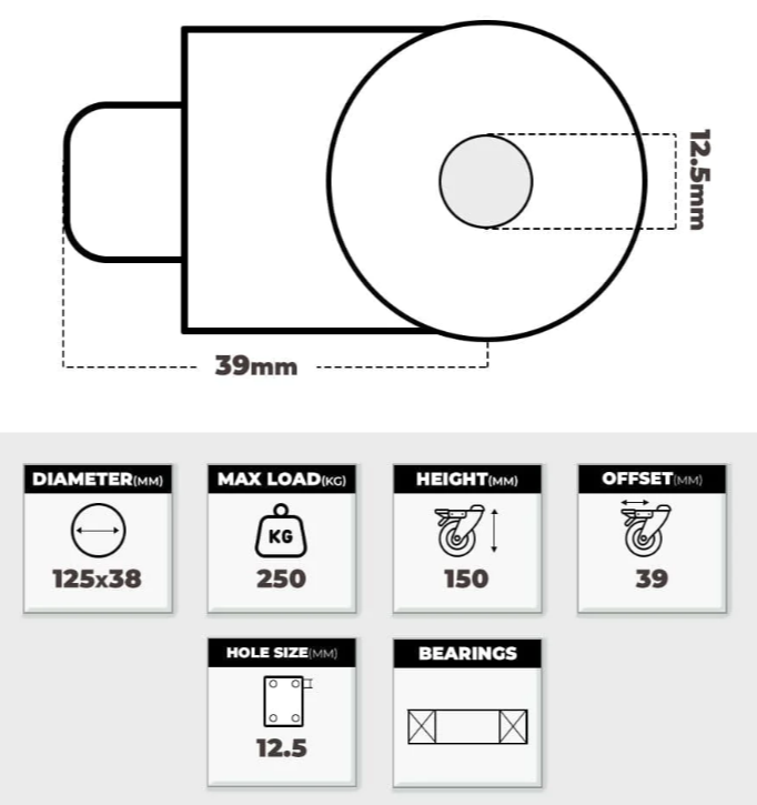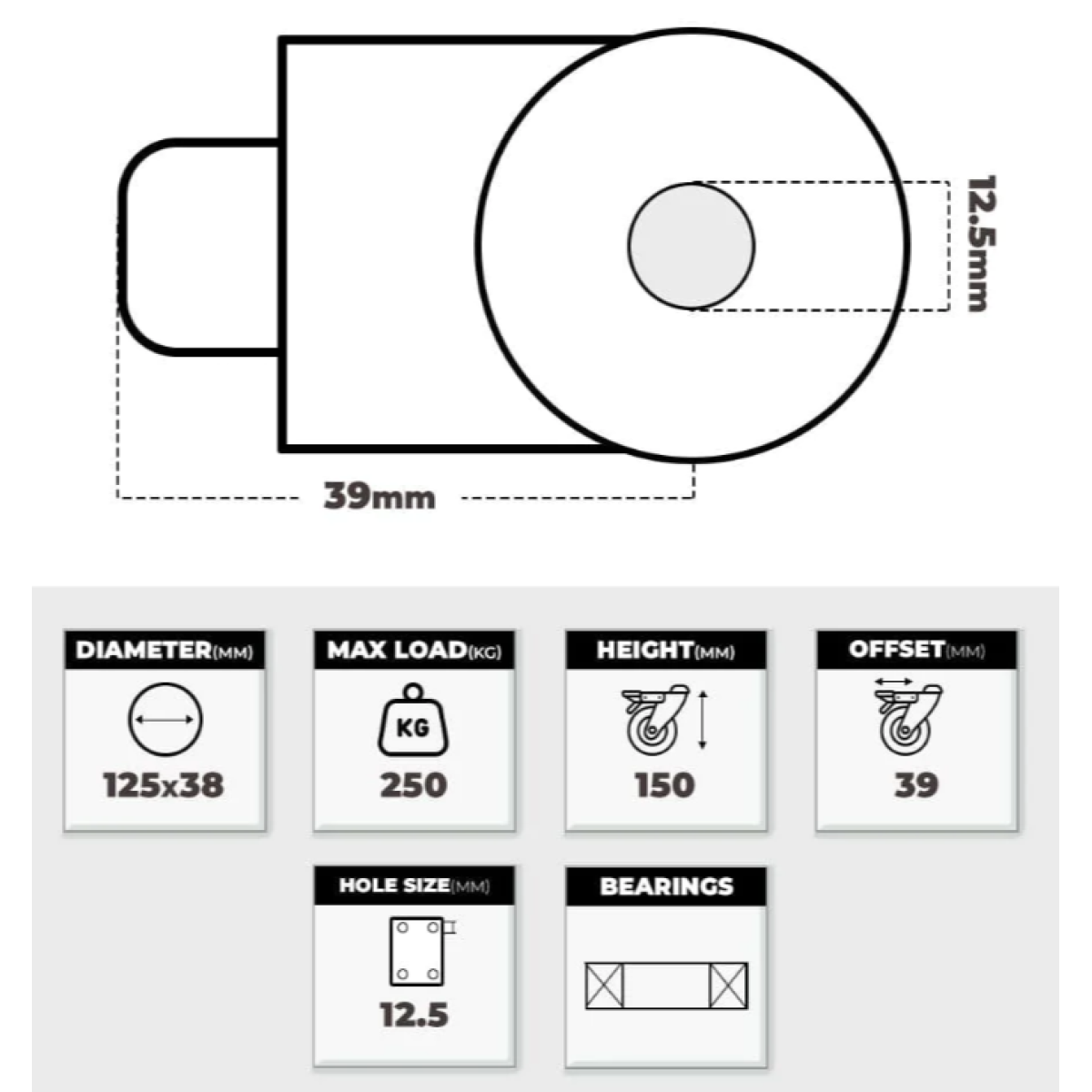 Gal plated pressed steel componentry with one piece hard nylon castor wheel and quality tapered roller bearing with 2 piece dust cover. Ideal for multipurpose applications.
