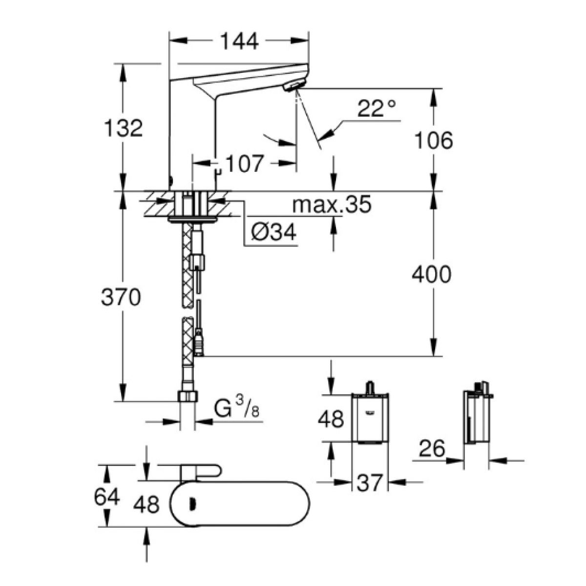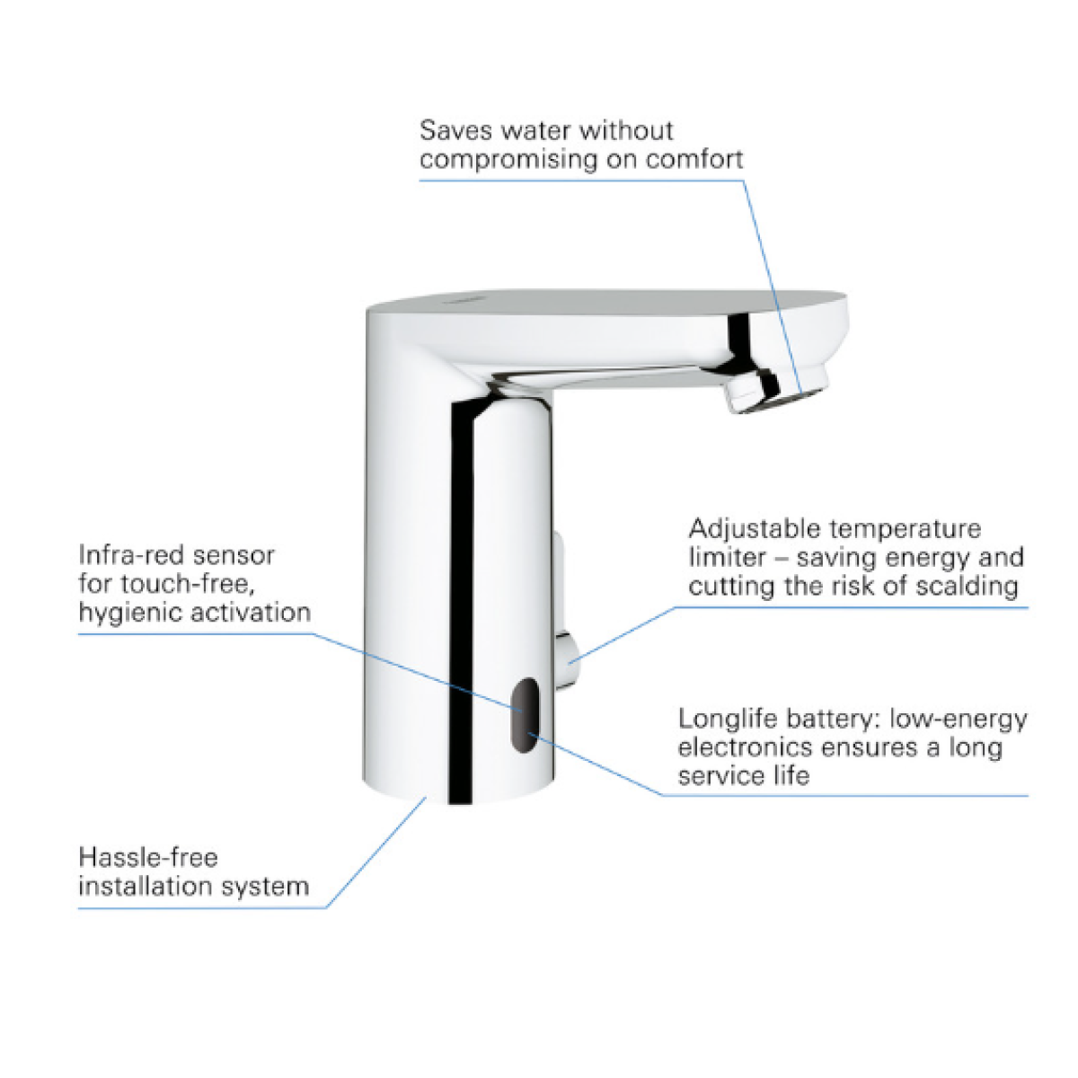The Grohe Get E infrared electronic basin mixer features a mixing device and adjustable temperature limiter, and an infrared sensor for bi-directional communication for monitoring, configuration and servicing. The sensor controlled Grohe Get basin mixer tap provides a hygienic, hands free system for a great addition to any modern bathroom. The Grohe Get sensor basin tap is WRAS approved, with a durable chrome finish that complements the brass construction.