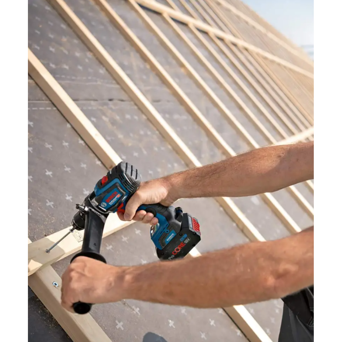 Delivering unrivalled power with 150Nm and 2,200 rpm maximizing efficiency on the job site, the 150Nm BITURBO Hammer Drill is known to be the world’s strongest drill. It has combined power from both ProCore18V 8.0ah & 12.0ah batteries and a new power Brushless motor. The GSB 18V-150 C has switchable kickback control which reduces the risk of sudden rotational torque reaction and allows for perfect tool control. The 150Nm Hammer Drill includes a two speed metal gearbox for fast drilling and driving applications, and Rapid Mode Selection for precise screw driving. Alongside electronic angle detection to ensure long screws are always in the right angle for sloper surfaces.