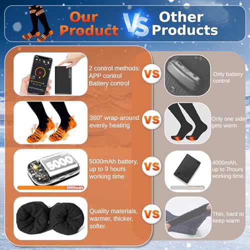 🔥【Unisex Size Heated Socks】The battery operated heated socks with APP control can fit a wide range of sizes for Men and Women: USA size 7-12. Long tube socks can cover the calf, which is warm and stylish, perfect for pairing with boots or ski boots!