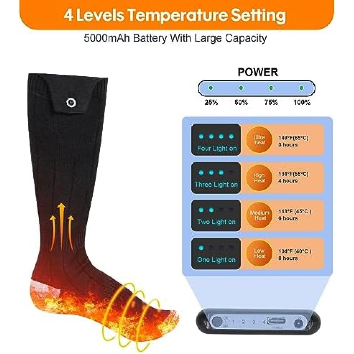 4 Heat Settings: The socks have an easy-to-use batteries with four heat settings.