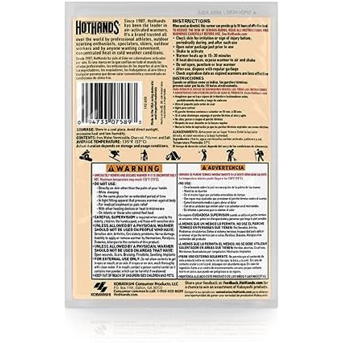 HotHands Body & Hand Super Warmers are single use air-activated heat packs that provide everyday warmth and are ideal for keeping your body warm when the temperature gets cold. These warmers provide safe, natural heat, so you can enjoy the great outdoors during those harsh winter months. The body warmers are larger than the normal hand warmer, and are designed to last longer than standard heat packs. Convenient, Compact, Portable. Thoughtfully designed so you can enjoy HotHands anytime, anywhere.