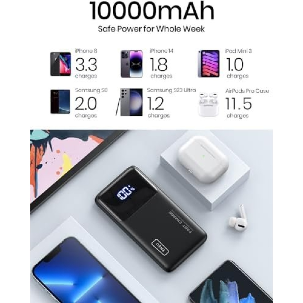 ๐๐จ๐ฐ๐๐ซ ๐๐จ๐ซ ๐๐๐๐ค๐ฌ: The slim but powerful INIU 10,000mAh portable charger can provide Samsung S8 with 2.0 charges, iPhone 8 with 3.3 charges, AirPods Pro MagSafe Case with 11.5 charges, and iPad Mini 3 with 1.0 charges.