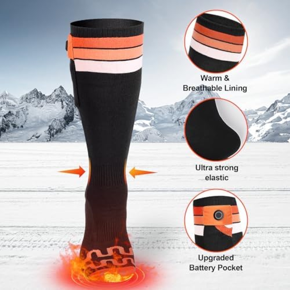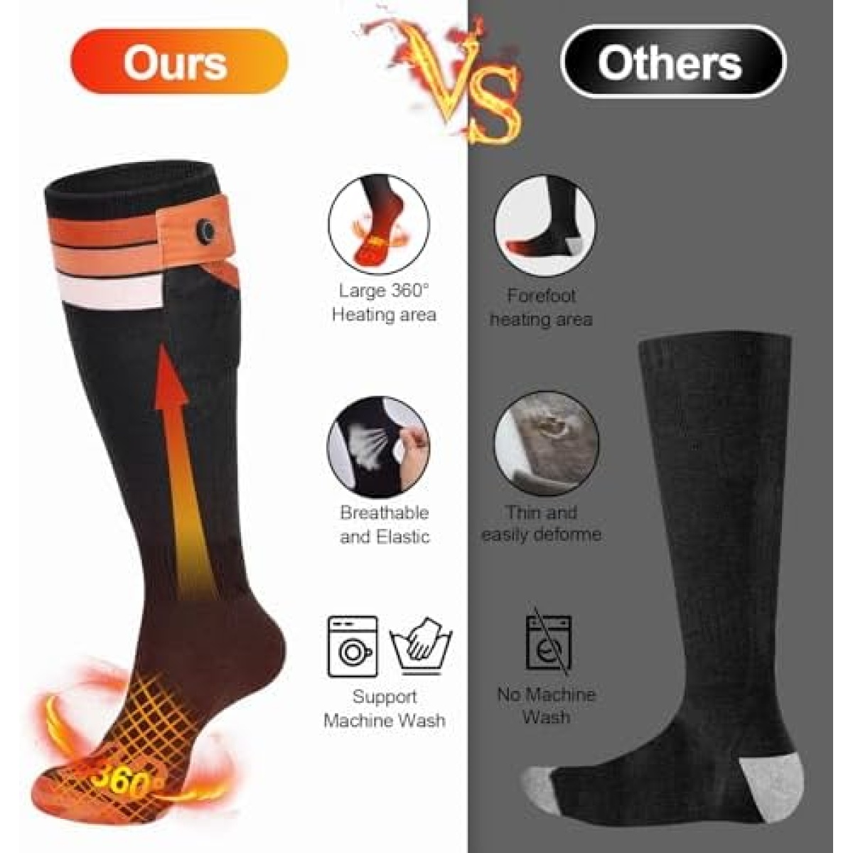 🧦【Long-Lasting & Powerful Battery】Equipped with a 7.4V 22.2WH battery that can be used continuously for up to 10 hours after a full charge. Our batteries are coated with PVC film coating technology, which makes the batteries smaller in size and lower in weight, and better fit the socks and not easy to fall out.