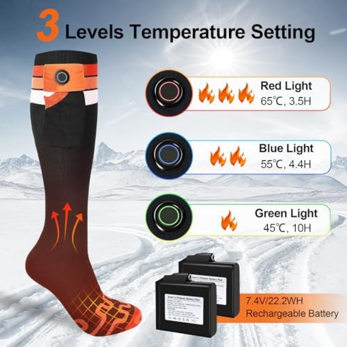 🧦【3-Level Temperature Adjustment】Equipped with a 3-level heating controller, these socks allow easy adjustment of the comfort temperature with a short press of the temperature setting button. The red LED indicates high-temperature mode (65℃/4H), the blue LED for medium-temperature mode (55℃/7H), and the green LED for low-temperature mode (45℃/10H), catering to various warmth preferences and providing a personalized heating experience.