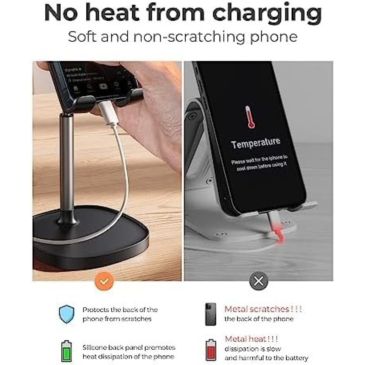 USER-FRIENDLY DESIGN: [No bent & tangling & tip over worries] when using while charging. Due to bent cable, the low phone dock maybe fall over. LISEN stylish adjustable phone holder for desk has a reserved charging hole design, supports cable management, [No bent & tangling & tip over worries]. This phone pad will not cover the subtitle when you watch the video