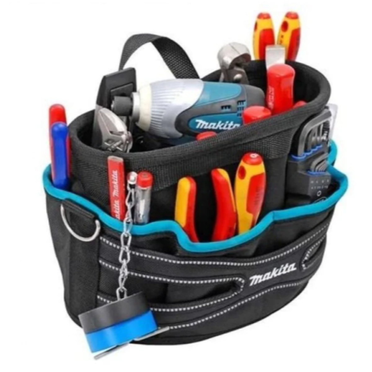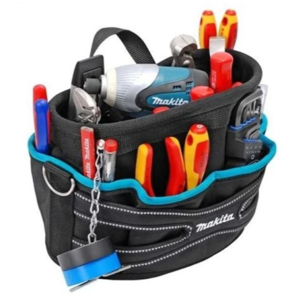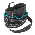 The Makita Tool Bag P-72045 has a comfortable polyester handle for maximum carrying comfort. An adjustable heavy-duty shoulder strap with a special pad makes transporting a filled bag as comfortable as possible. The bag has metal carabiners for fastening the belt, so it can be unfastened at any time. A rigid and waterproof plastic sheet is installed in the bottom of the bag to strengthen the bottom and maximize the protection of the tool. The open design provides easy access to the tool.