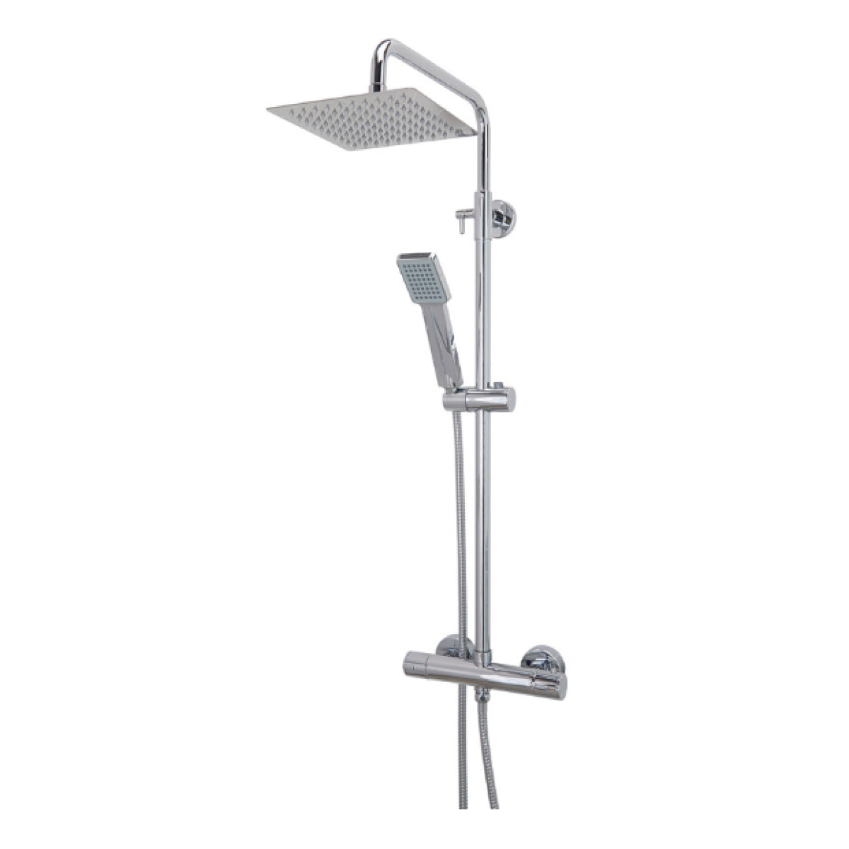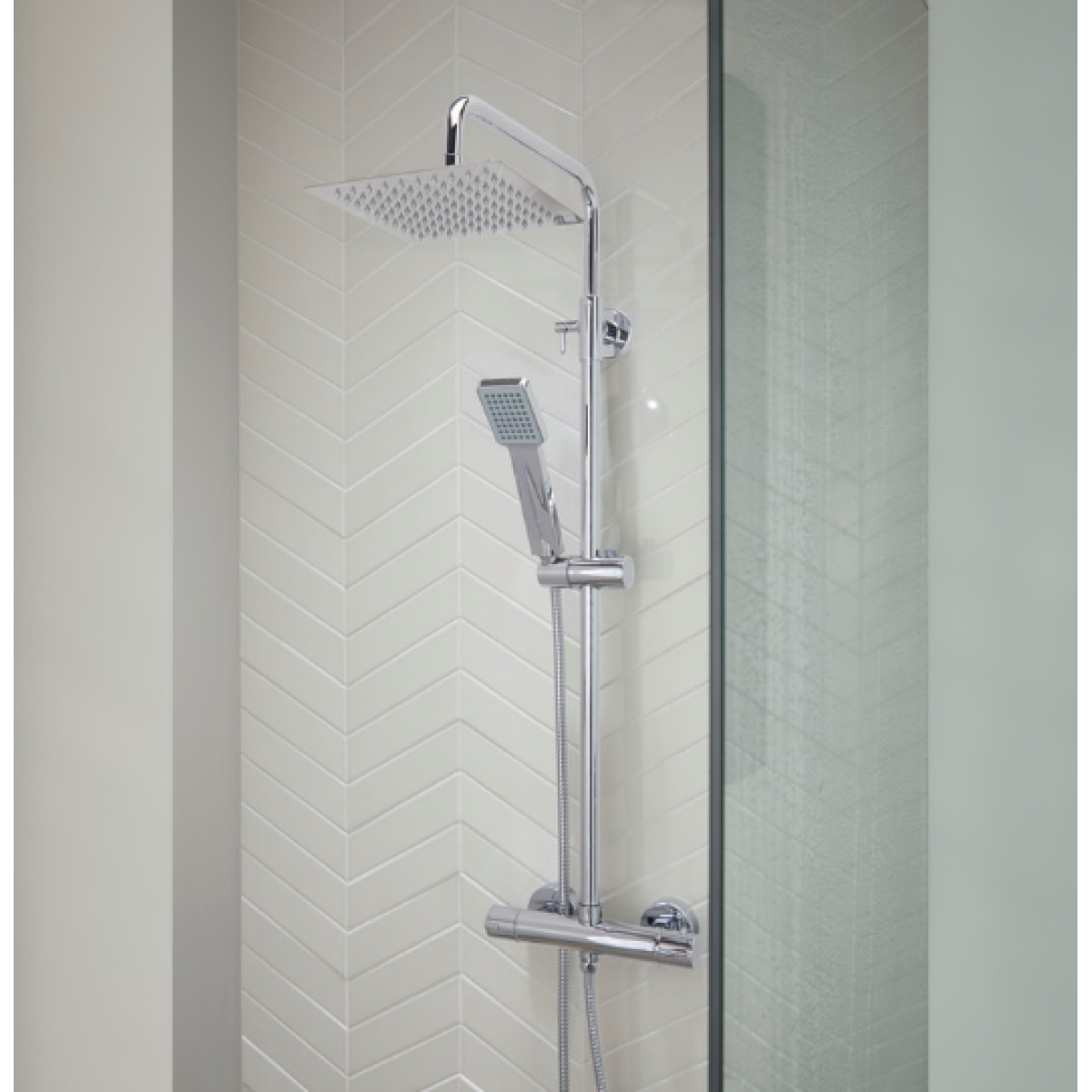 The main showerhead has a wide square panel and is extra thin so less water goes for longer, saving energy. You can adjust its height using the dial at the side of the pipe to bring it closer to your head. Its thermostatic bar keeps the temperature of the shower steady, even if hot water diverts to a tap in another room. The precise temperature gauge stops your boiler from generating excess heat, saving you money on heating costs. The chrome finish keeps the shower looking new and resistant to corrosion.