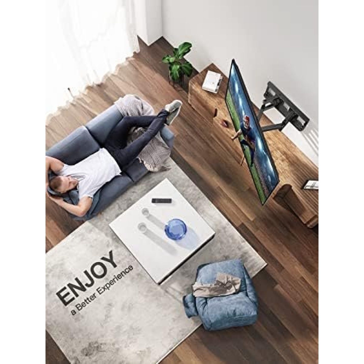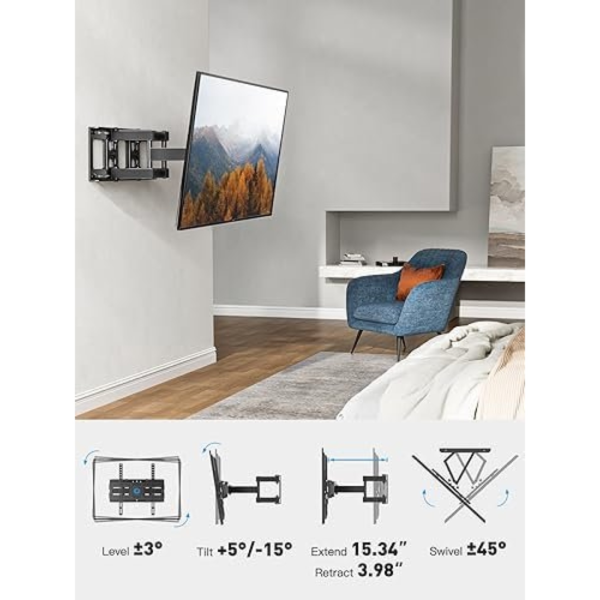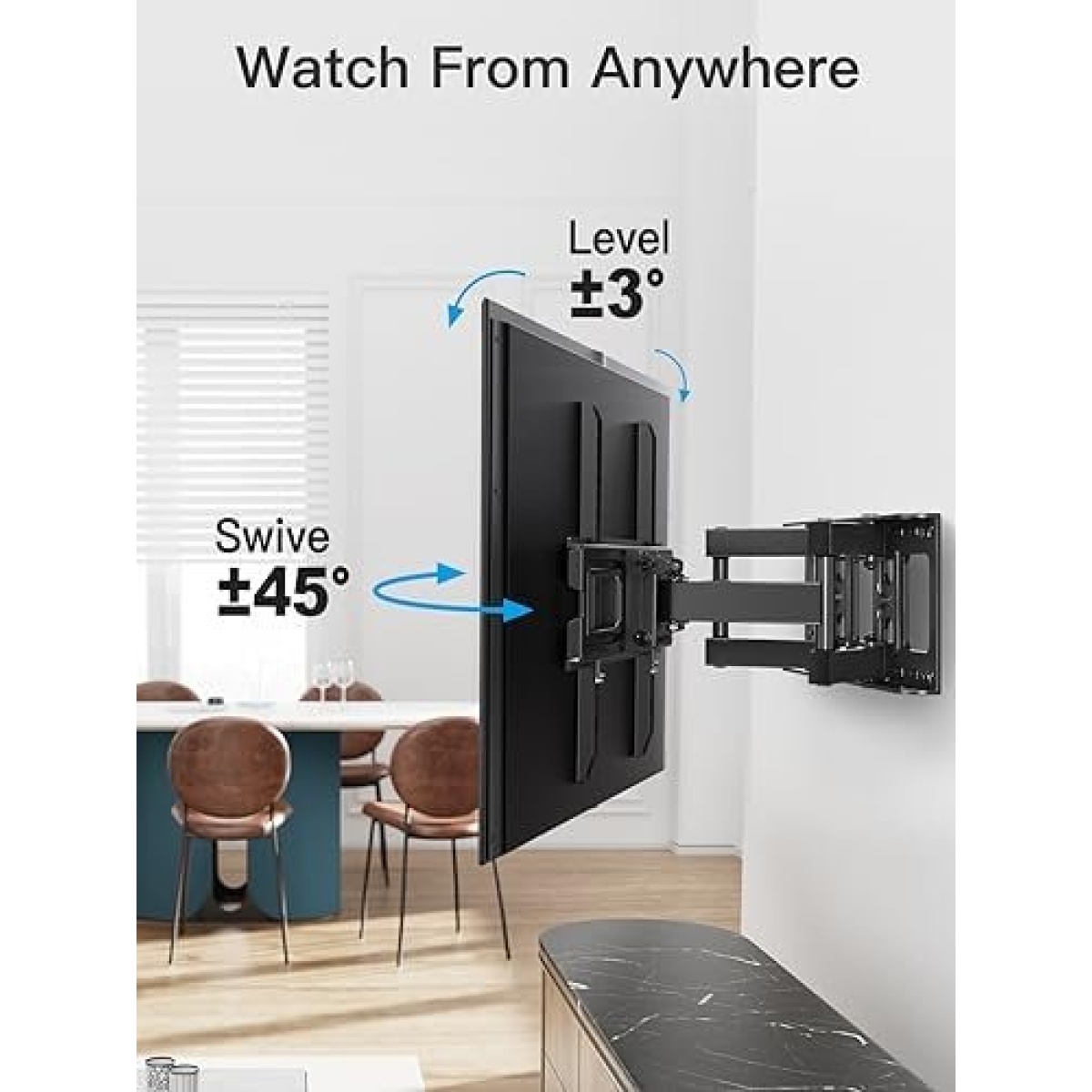 OPTIMIZED VIEWING EXPERIENCE: This Full motion tv mount is able to reduce glare with vertical tilt ranging from +5 to -15 degrees, customize your viewing angle with +/-45 degree full motion swivel left to right., level the TV by +/-3 degrees to fine-tune the TV’s position.
