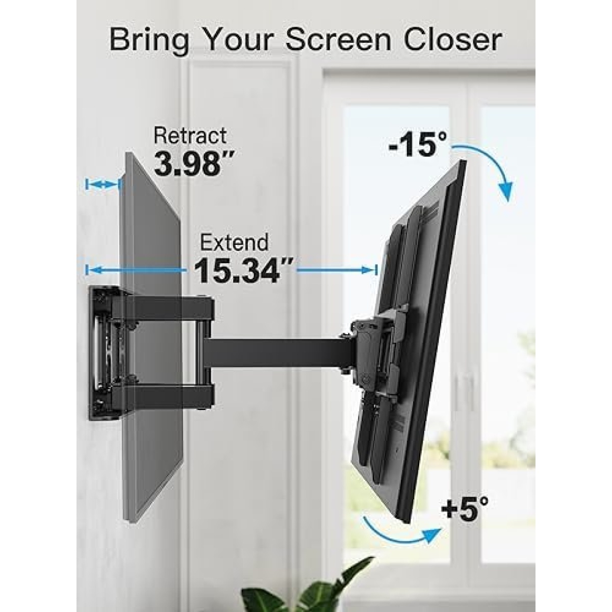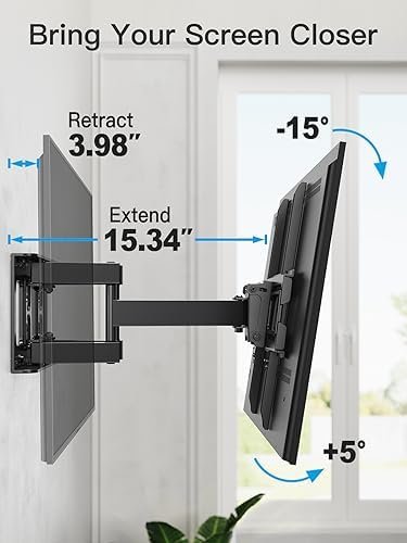 SAVE SPACE: The stable and sturdy TV wall mount extends out 15.34 inches max for viewing and collapses to 3.98 inches from the wall to save space for a cleaner look. Great solution for rooms with multiple viewing areas.