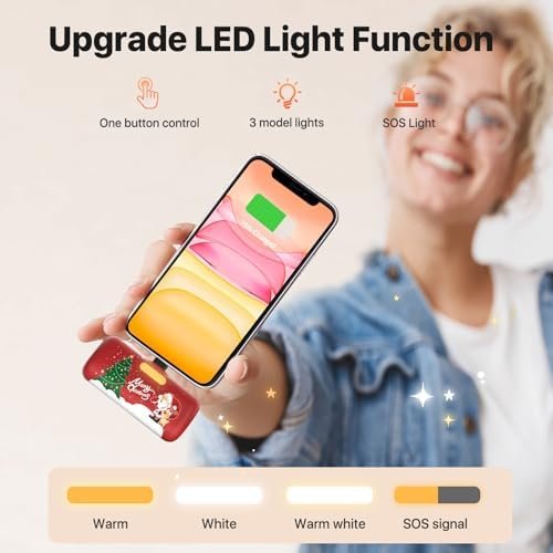 • 4 Modes LED Light & Fast Recharging: small portable charger with LED lantern that can be switched to 3 colors of warm – white – warm white, you can use it as fill light for selfies and flashlight in the dark. Recharging the cell phone charger for 50% power within 30 mins with provided USB C cable and adapter(not included), which can charge your iPhone 14 from 20% to 60% without using the phone.