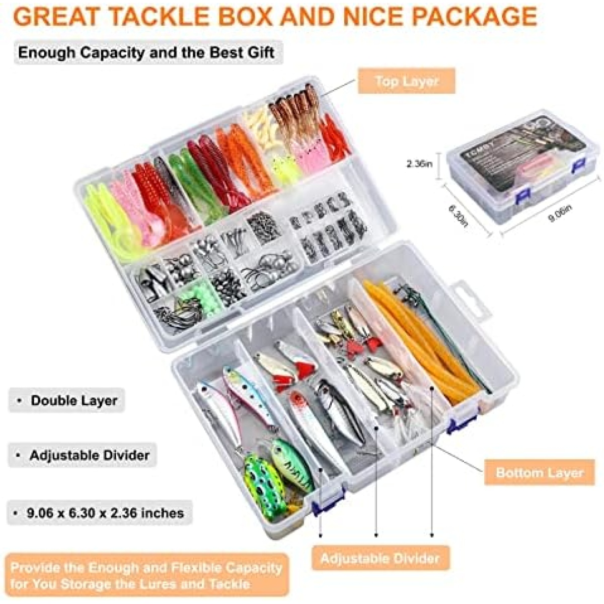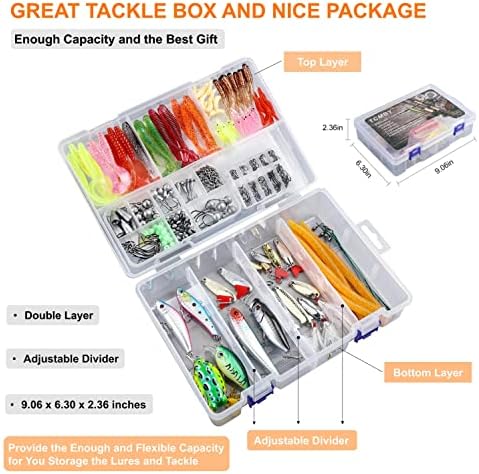 【Easy to Carry Around】- The compact fishing tackle kit with a double-layer box which is convenient to get the exact fishing tackle you need. The loaded fishing tackle box measures 9.06 x 6.30 x 2.36 inches. The portable size will easy to carry around! You can take it to travel favorite fishing spot and enjoy fishing whenever and wherever you want.