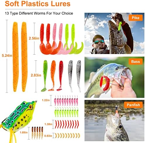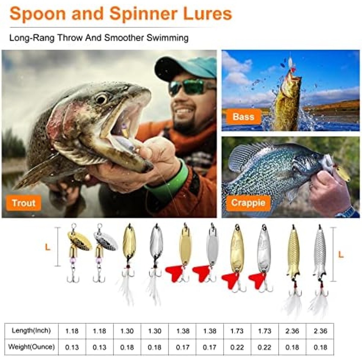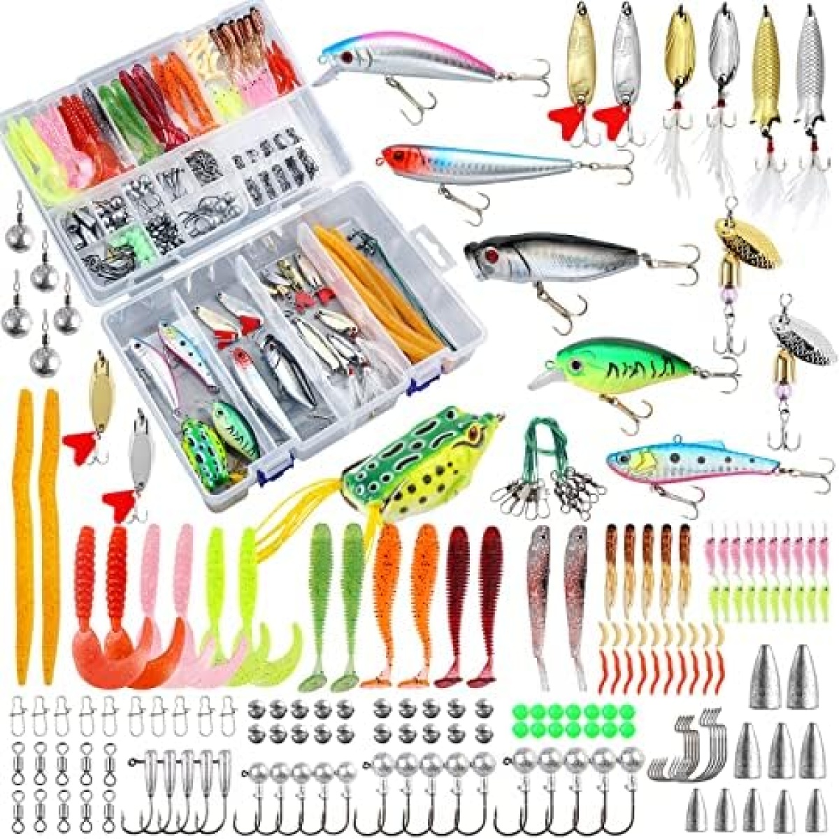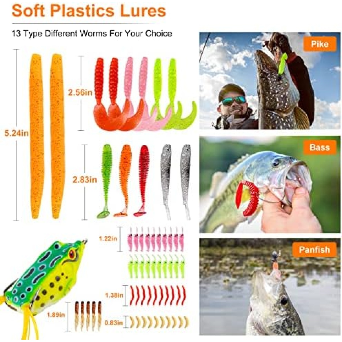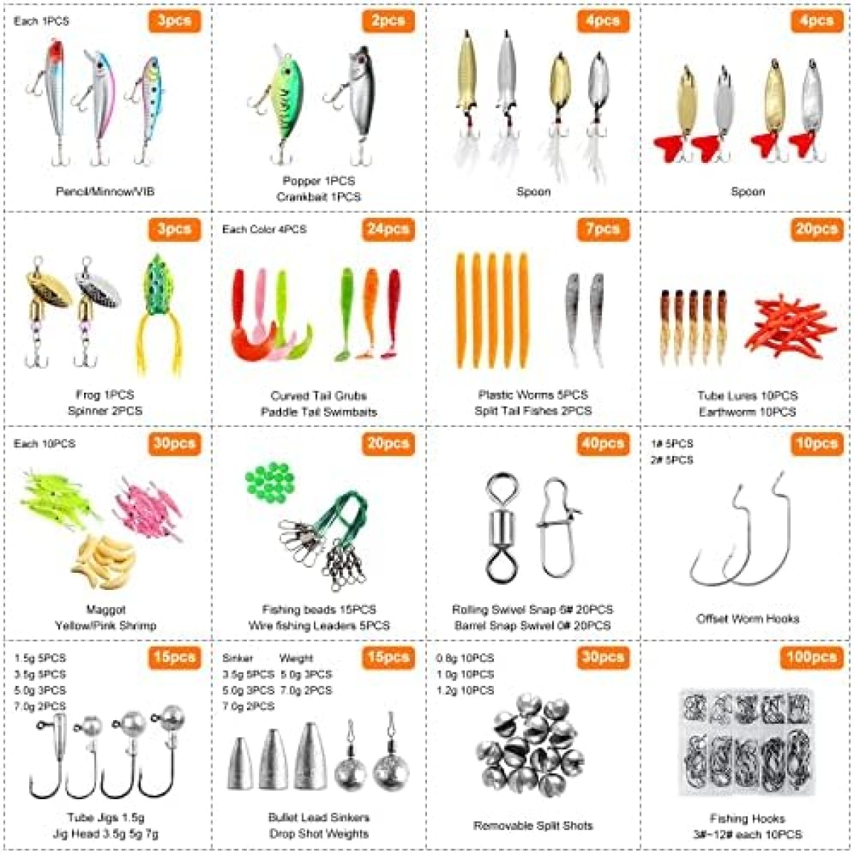 【Variety of Lures Combination】- The 327 pieces fishing lure set with everything you need: Crankbait, Popper, Pencil, Minnow, VIB, Spinner, Spoon, Soft Worms, Frog, Split Tail Fishes, Snap, Swivel, Offset Hooks, Jigs, Drop Shot Weights, Bullet Sinker, Split Shots, Beads, Leaders, Hooks.