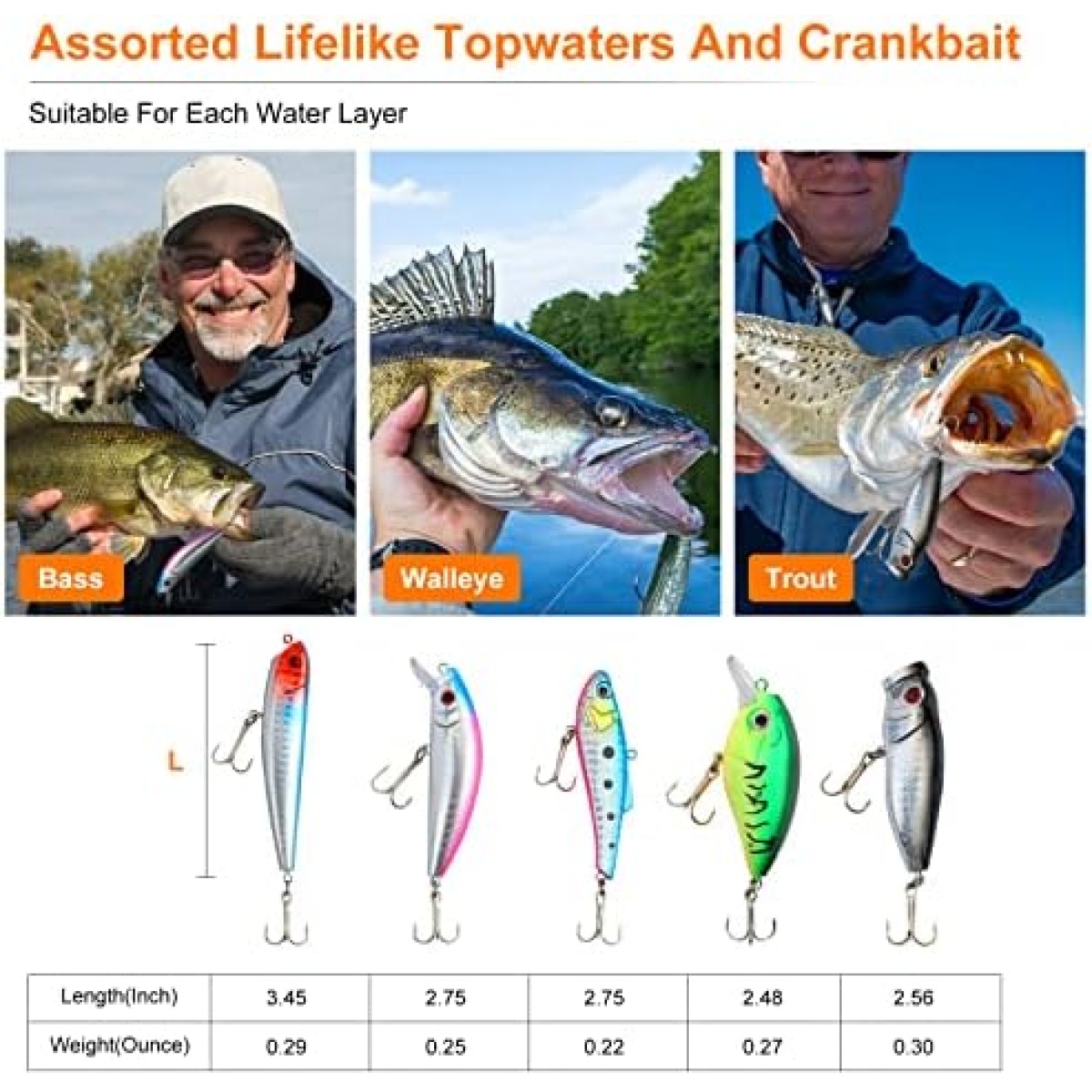【High Quality Material】- The lifelike design Minnow, Popper, VIB, Pencil and Crankbait lures are made by 3D Eyes and ultra-realistic fish pattern. And even the smartest fish think that the bait are a real fish which helps you to get fish easier. All lures are widely used and carefully selected, which are made of high-quality anti-corrosion stainless steel and plastic, strong and durable.