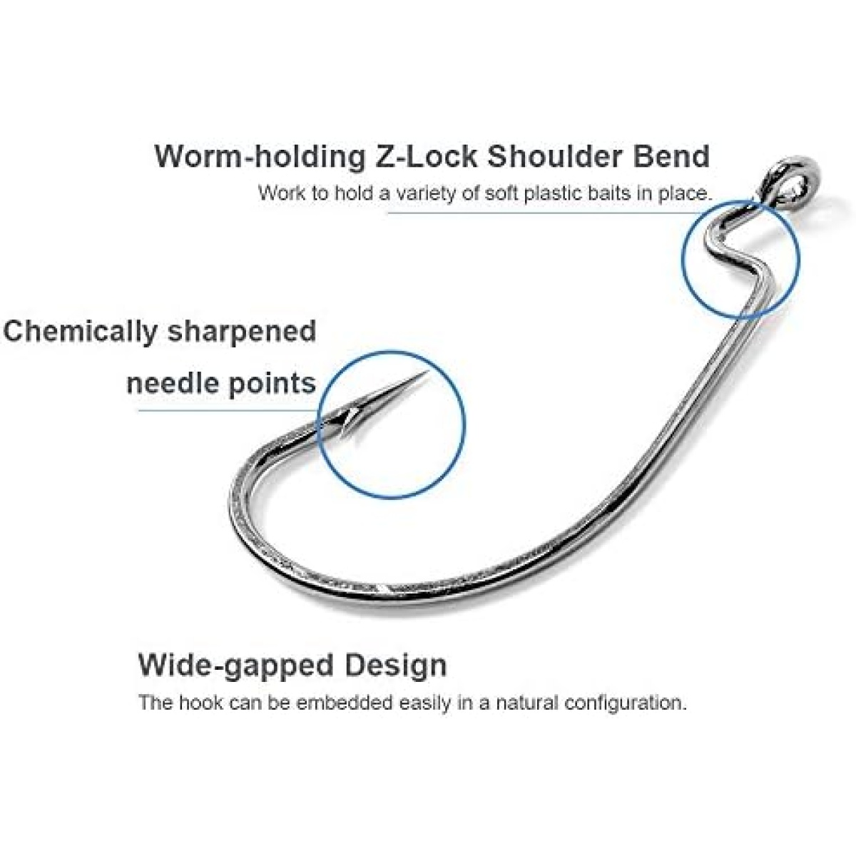 ►Wide-gapped Design — So worms of different sizes can be used and the hook can be embedded easily in a natural configuration. Wide bend reduces the chance of fish throwing the hook.