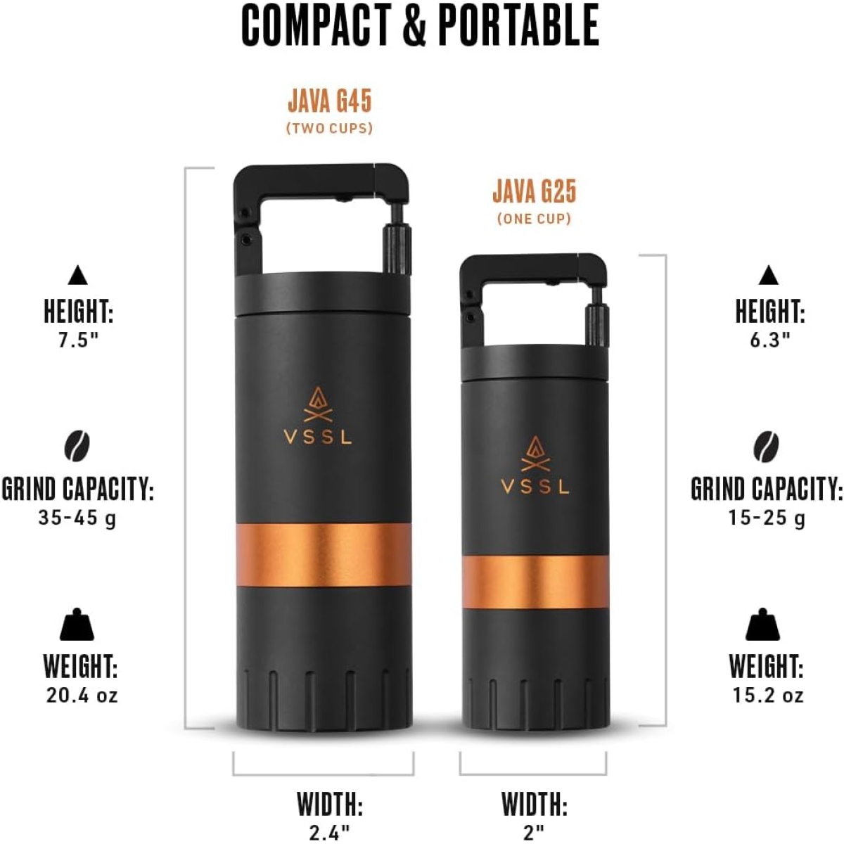 Most Consistent Grind: The conical burr and dual bearings of the VSSL Java G25 provide the most consistent grind size of manual coffee grinders