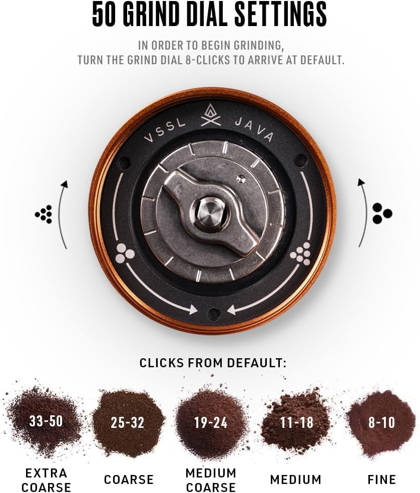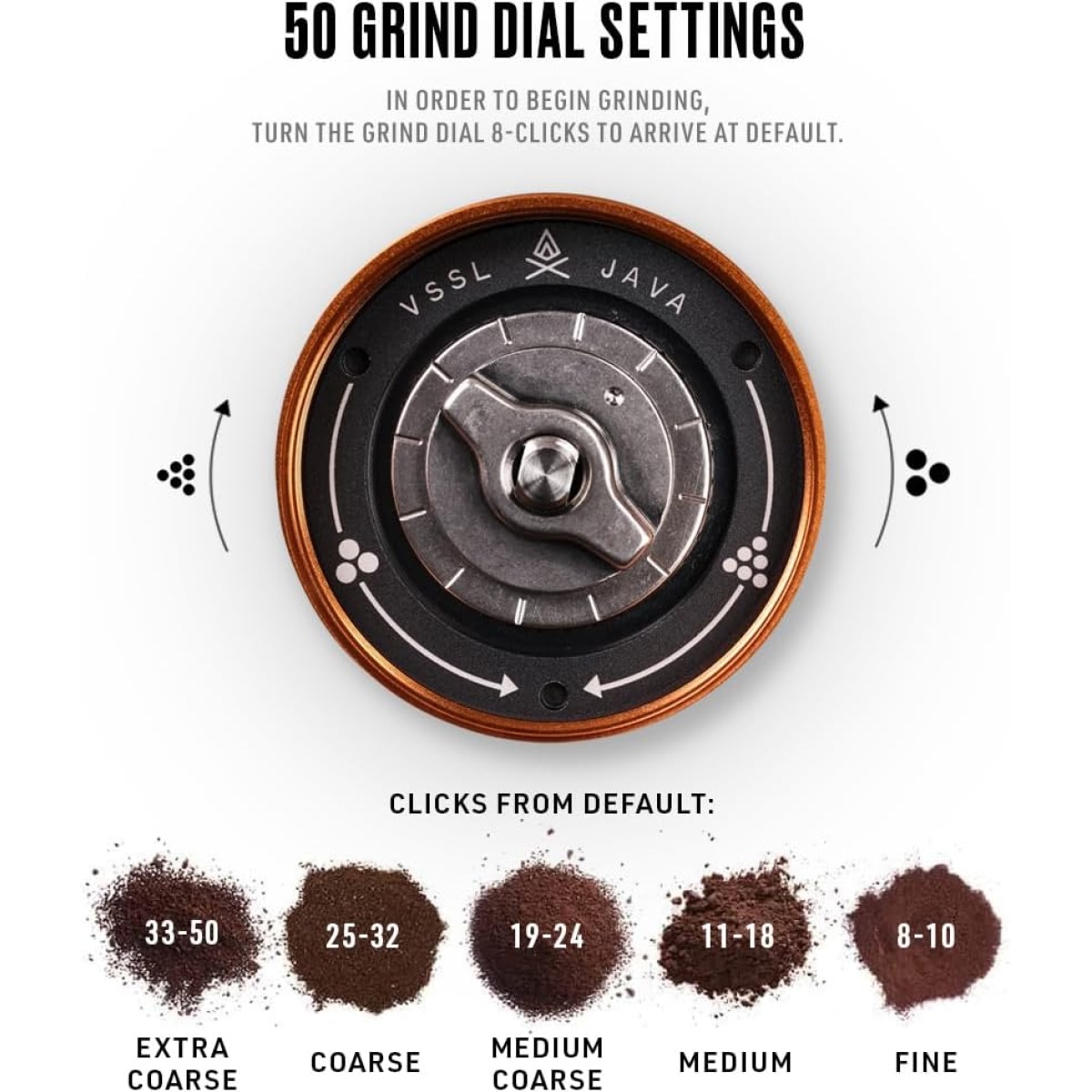 Adjustable Grind Settings: VSSL Java G25 has 50 unique grind dial settings to achieve the ideal consistency to match your chosen brew method for a cup of coffee with balanced, maximum flavor and aroma